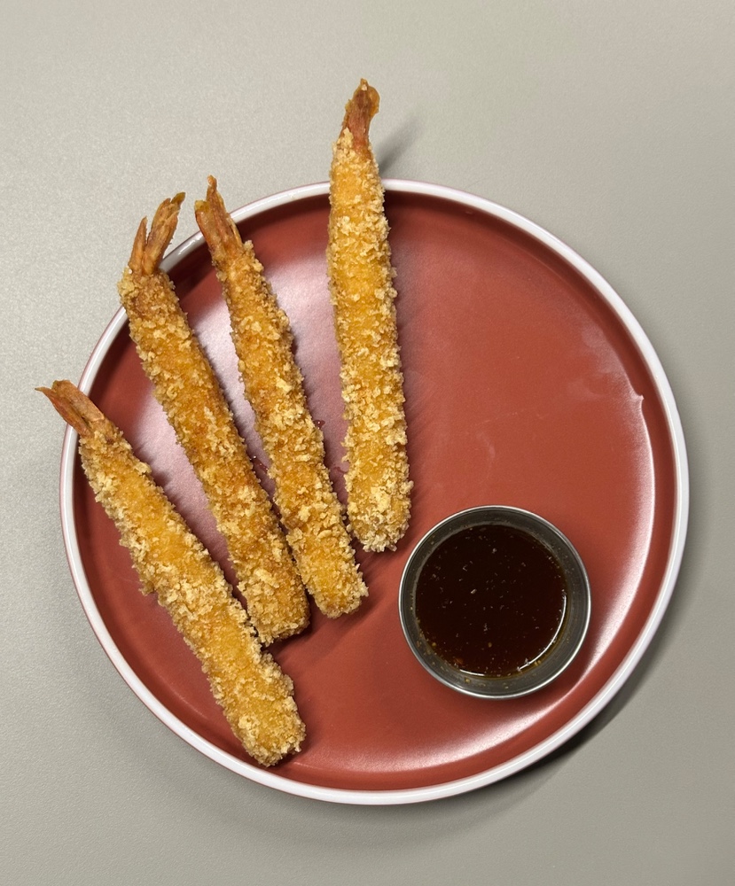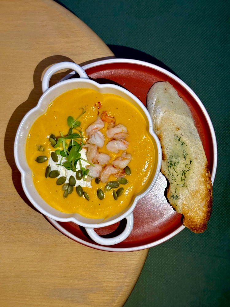 Гарбузовий суп з креветкою, крем сиром і часниковим багетом