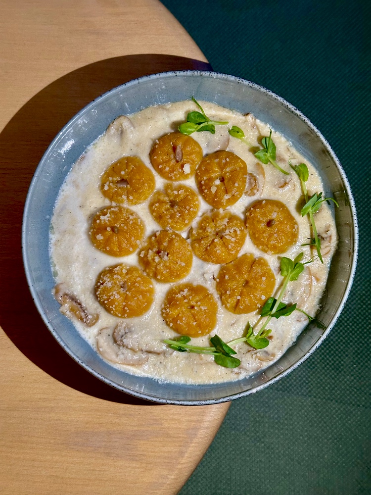 Гарбузові ньоки з вершковим, грибним соусом і пармезаном