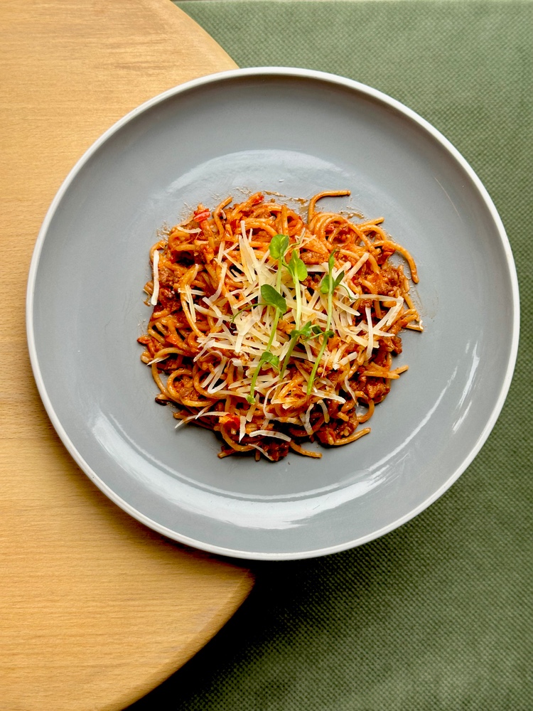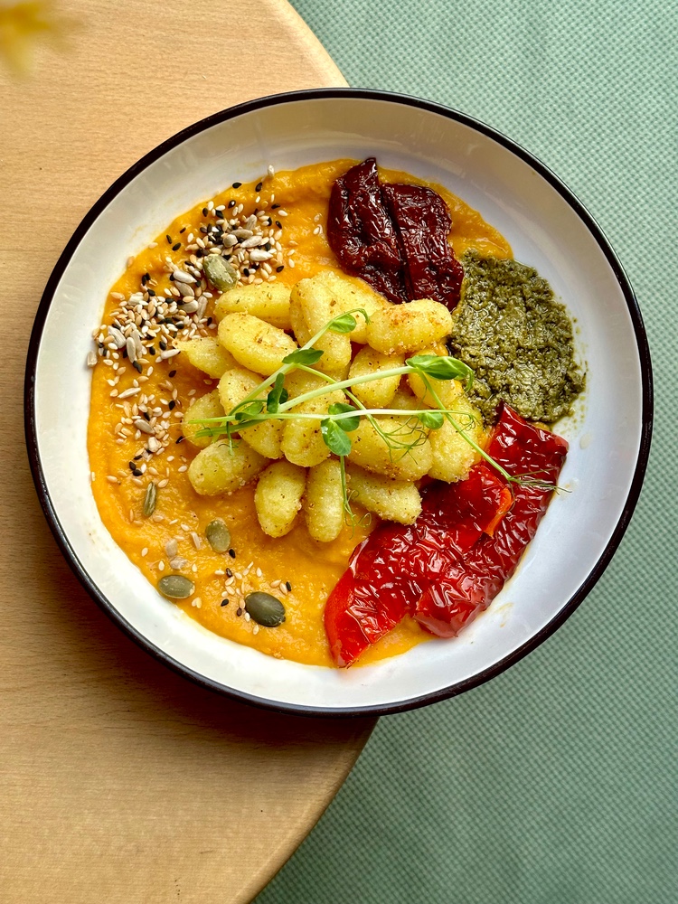 Картопляні ньоки з гарбузовим кремом, запеченим перцем , вʼяленими томатами і песто (веганська страва)