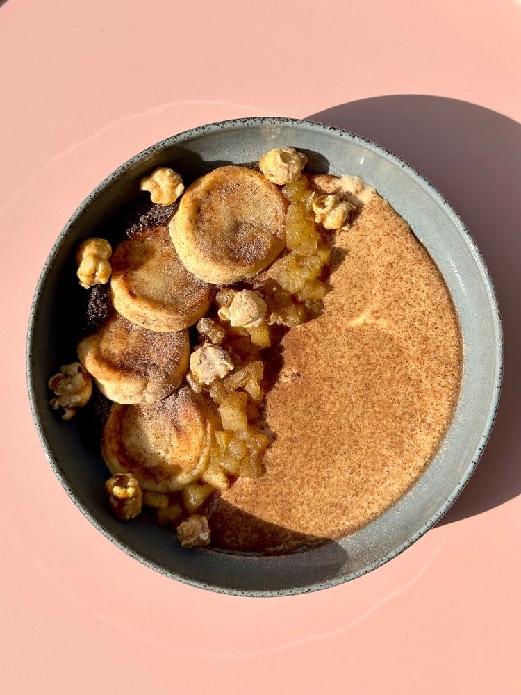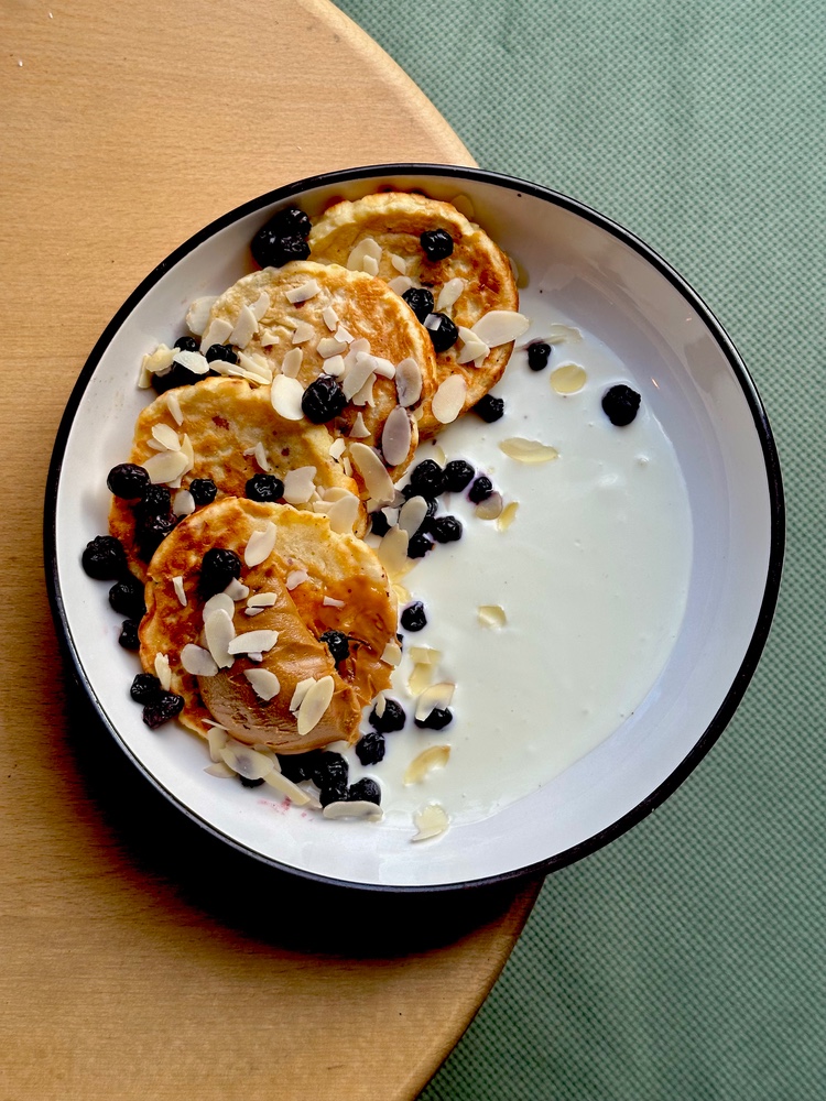 Яблучні оладки з ванільним кремом, пастою з печива лотус, лохиною і мигдальними пластівцями