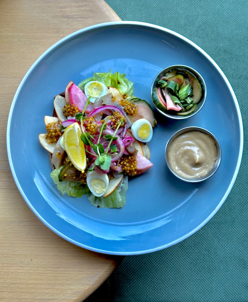 Тост з оселедцем, маринованою цибулькою, яблуком і перепелиними яйцями