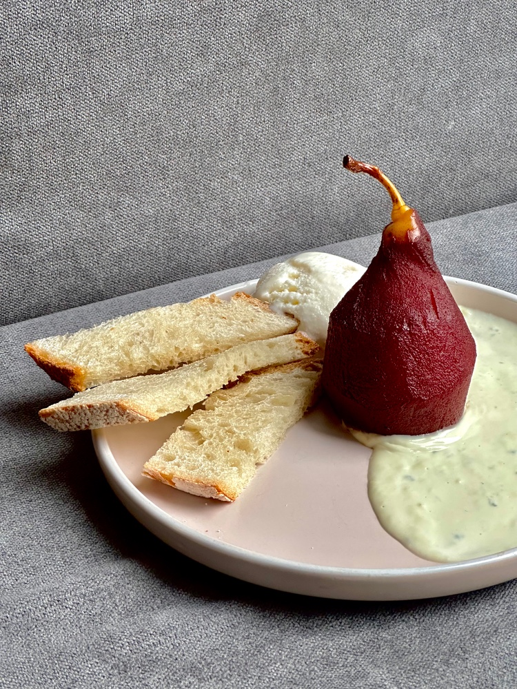 Груша, томлена у пряному вині з соусом дор блю, кулькою пломбіру і грінками