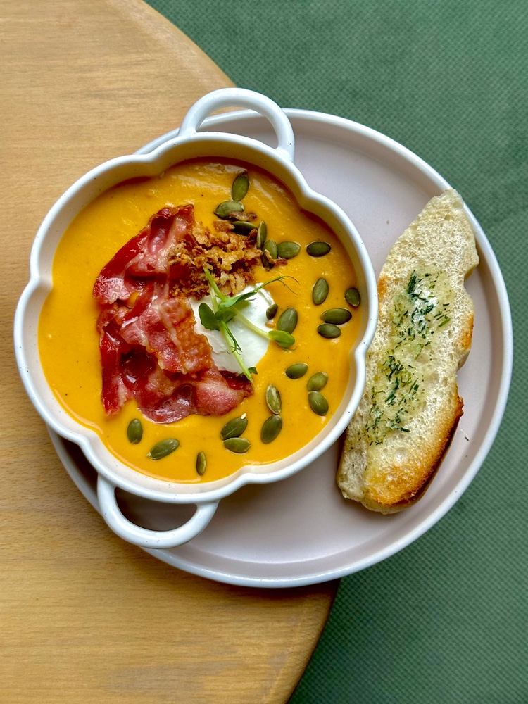 Гарбузовий суп з хрумким беконом, крем сиром і часниковим хлібчиком
