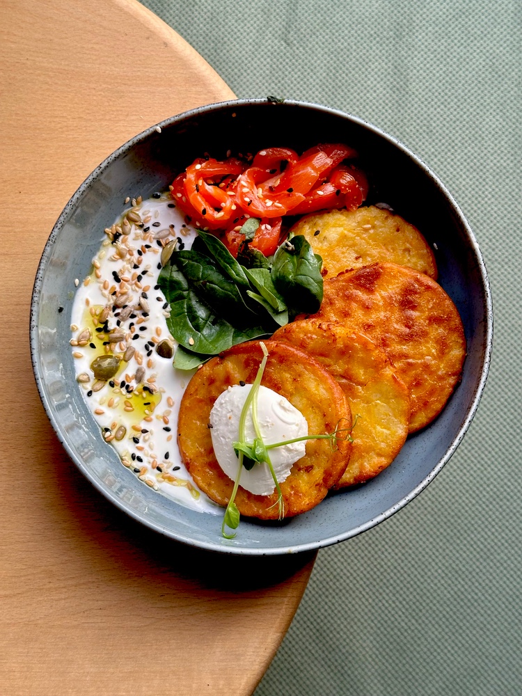 Гарбузові оладки з лососем, крем сиром, лимонною сметаною і зеленню
